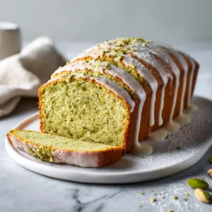 A soft, nutty pistachio loaf cake topped with a smooth vanilla glaze, perfect for dessert or afternoon tea.