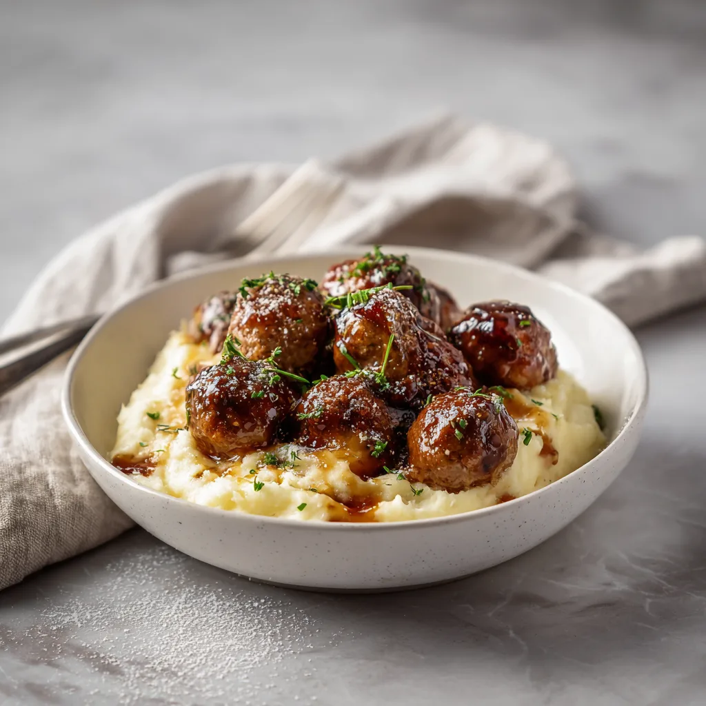 bourbon glazed pork meatballs, creamy mashed potatoes, easy dinner recipes, comfort food, savory meatball recipes