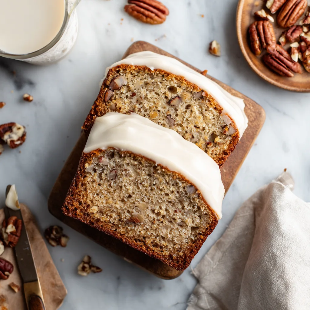 By turning those flavors into a butter pecan quick bread, we get the best of all worlds: easy preparation, sliceable convenience, and a texture that works beautifully with cream cheese icing. The icing isn’t just decoration—it adds a tangy contrast that keeps the loaf from tasting too heavy.