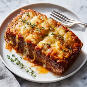 Unlike traditional meatloaf recipes that rely heavily on ketchup or tomato-based glazes, this version leans into French onion flavors—beefy, slightly sweet, and intensely savory. The result is a meatloaf that’s moist, flavorful, and irresistibly cheesy in every slice.