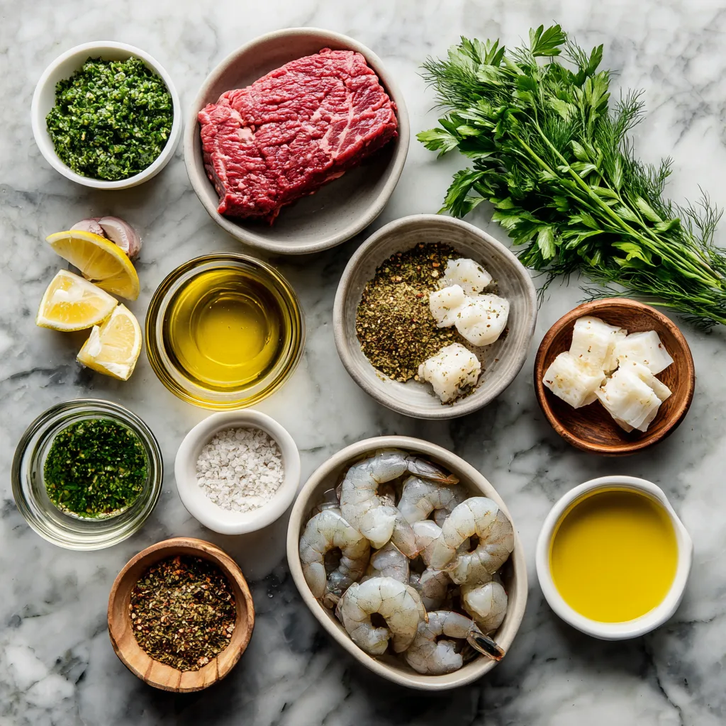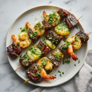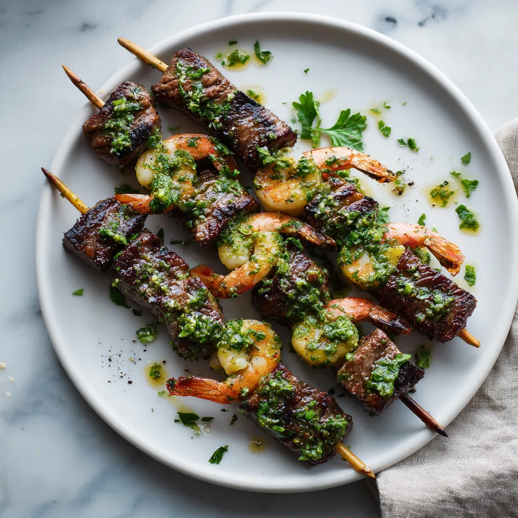 Juicy steak and shrimp skewers grilled to perfection and finished with fresh, vibrant chimichurri sauce.