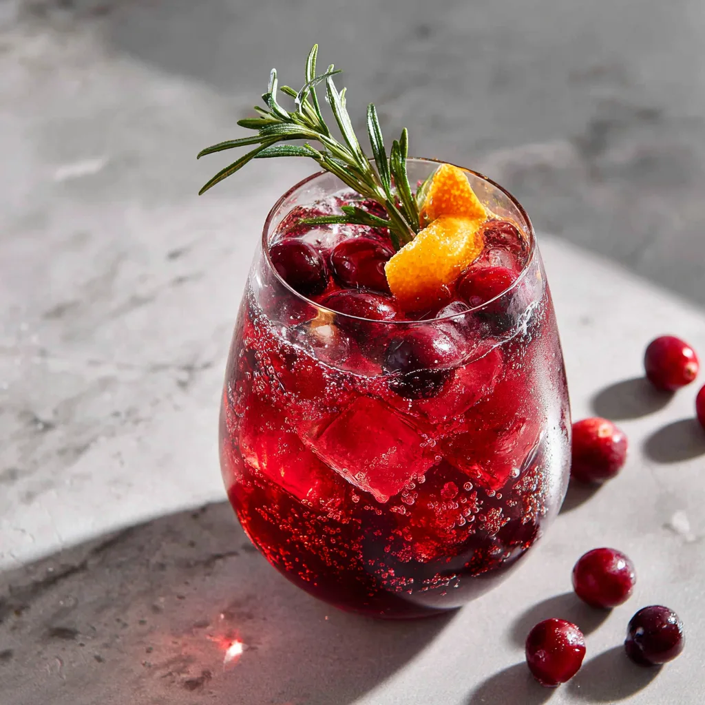 A festive, alcohol-free cranberry tonic with botanical notes, citrus, and rosemary for a holiday-ready mocktail.