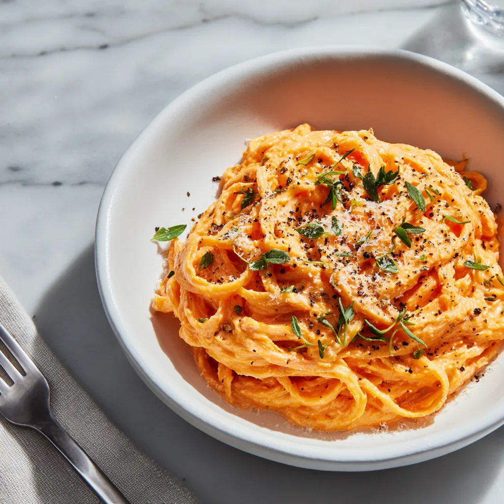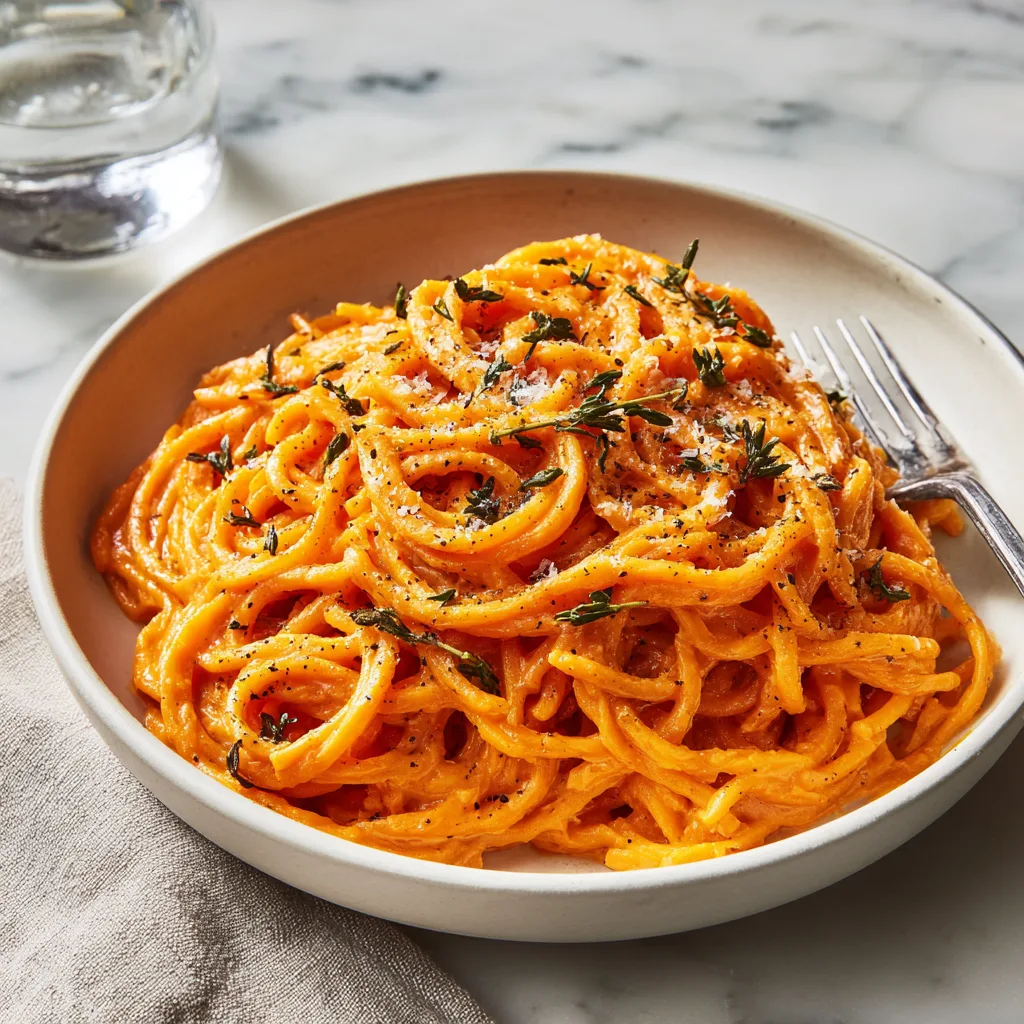 A rich and comforting pasta dish made with a silky sweet potato-based cream sauce, perfect for cozy dinners.