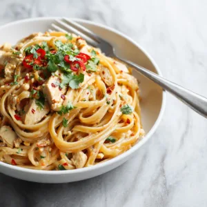 Fusion recipes can sometimes feel forced, but this one makes sense. Thai cuisine is known for its mastery of balance—sweet, salty, sour, spicy, and umami—while pasta provides the perfect neutral canvas to carry those flavors. Coconut milk replaces heavy cream, peanut butter adds body and richness, and red curry paste brings depth and warmth. Chicken acts as a mild, protein-rich base that absorbs the sauce beautifully.