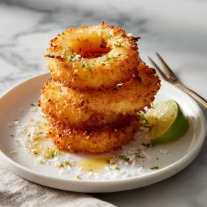 There’s something magical about pineapple. Sweet, juicy, and naturally bright, it instantly transports you to a beachside afternoon with warm sun and salty air. Now imagine that pineapple transformed—coated in a crunchy coconut crust and lightly fried or baked until golden. That’s exactly what Crispy Coconut Pineapple Rings deliver: a tropical dessert that’s crispy on the outside, juicy on the inside, and completely irresistible.