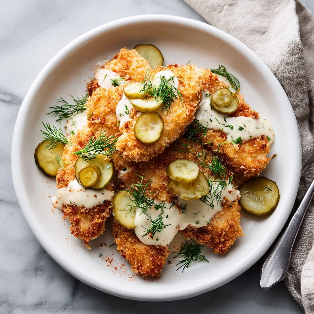Drizzle sauce over crispy chicken or serve on the side for dipping. Garnish with fresh dill and pickle slices.