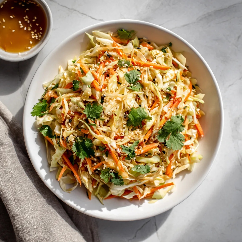 A fresh, vibrant cabbage slaw tossed in a sesame ginger dressing with herbs and crunchy toppings.