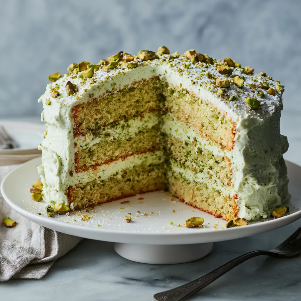- Assemble the cake by spreading frosting between layers, then frost the top and sides. Garnish with crushed pistachios and a light dusting of powdered sugar if desired.
