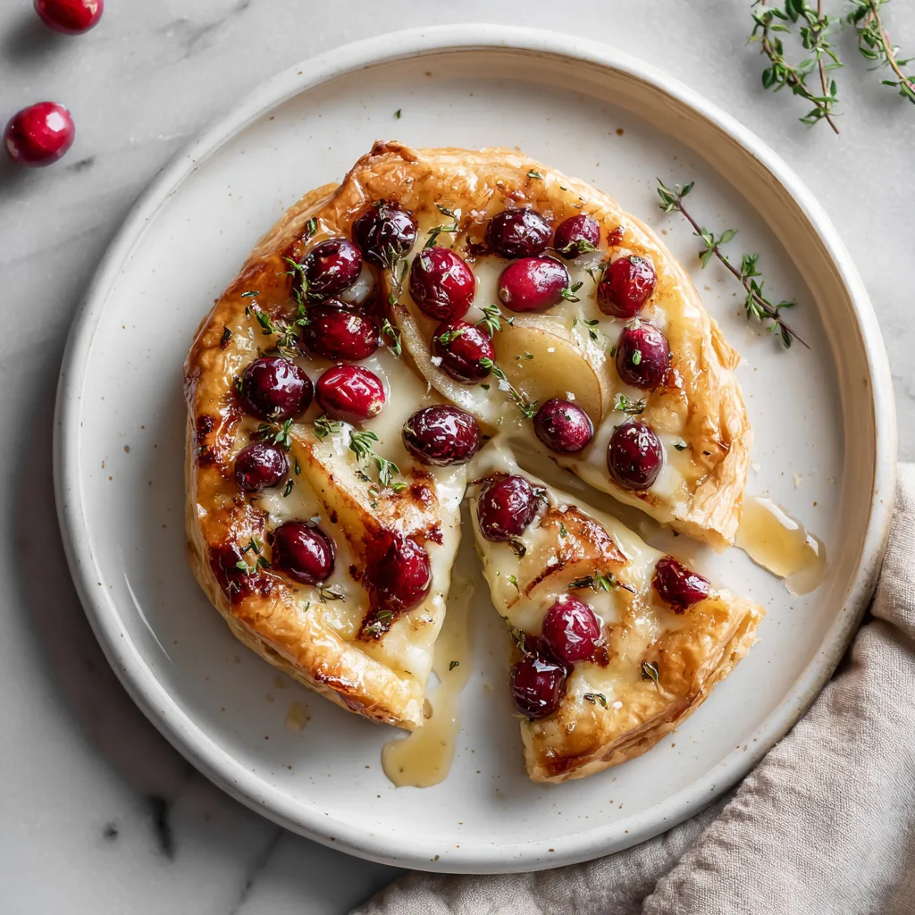 A flaky puff pastry tart layered with cranberry sauce, creamy brie, and sweet pears.