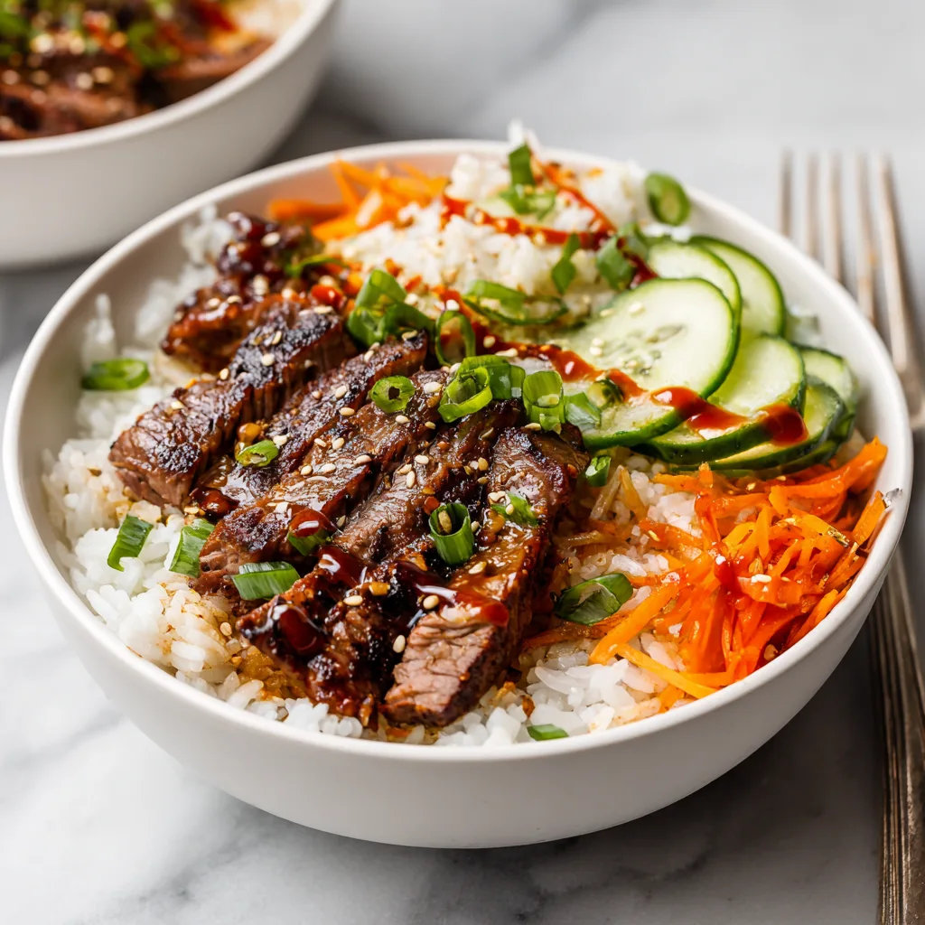 Tender Korean BBQ–marinated steak served over rice with fresh vegetables and bold, savory-sweet flavors.
