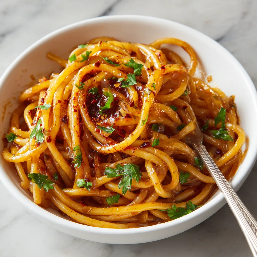 At its heart, this recipe celebrates onions. Slowly cooked until golden and jammy, they develop natural sweetness and depth. When paired with garlic, chili flakes, soy sauce, and a splash of pasta water, they become the base of a glossy, fiery sauce that tastes complex without being complicated.