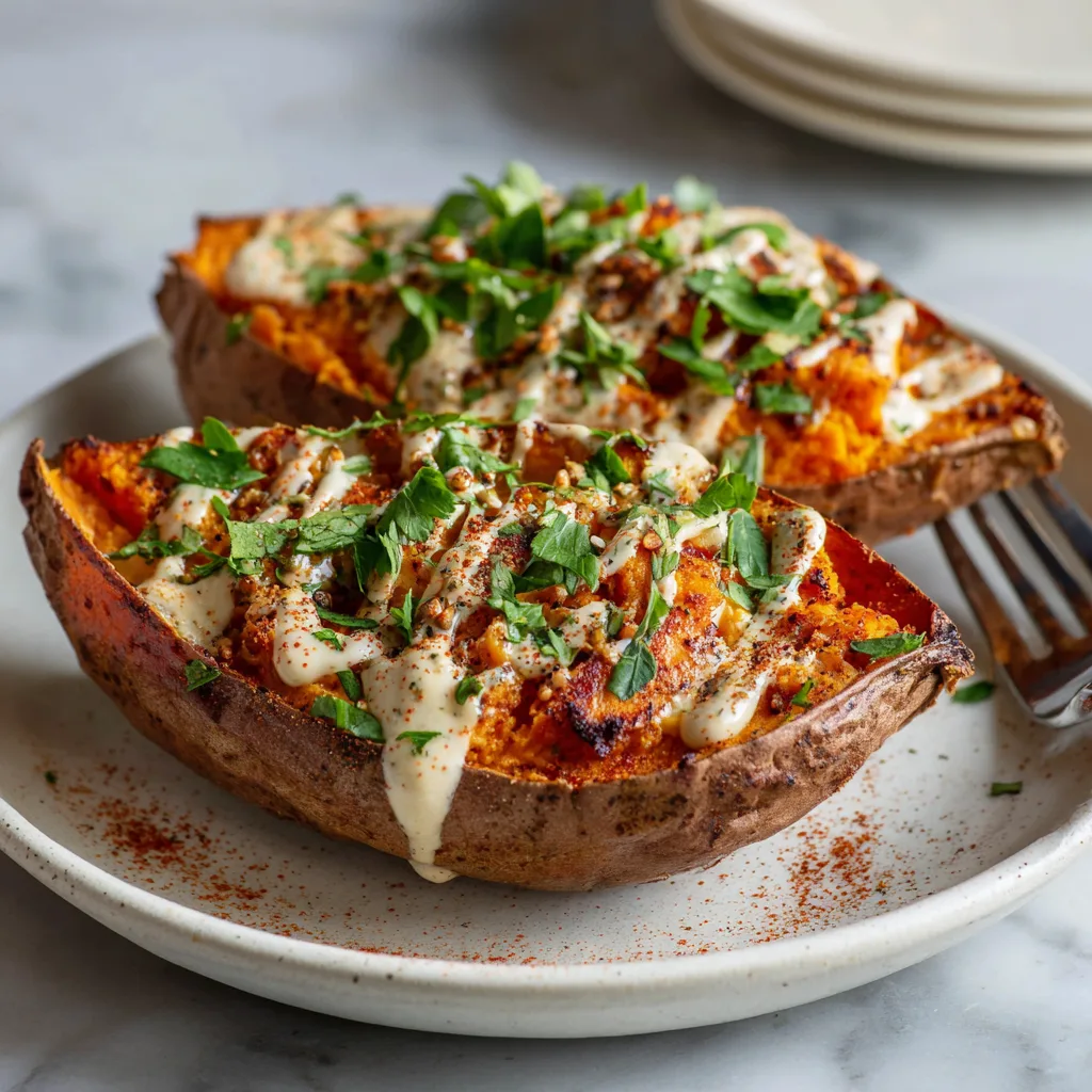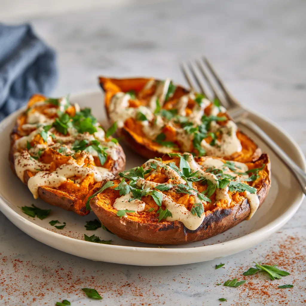 6. Add Finishing Touches: Sprinkle crumbled feta over each stuffed sweet potato. Drizzle with tahini and garnish with fresh parsley.