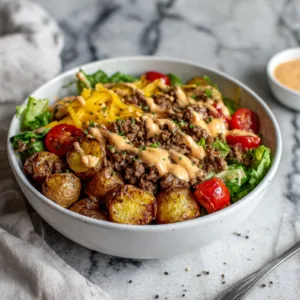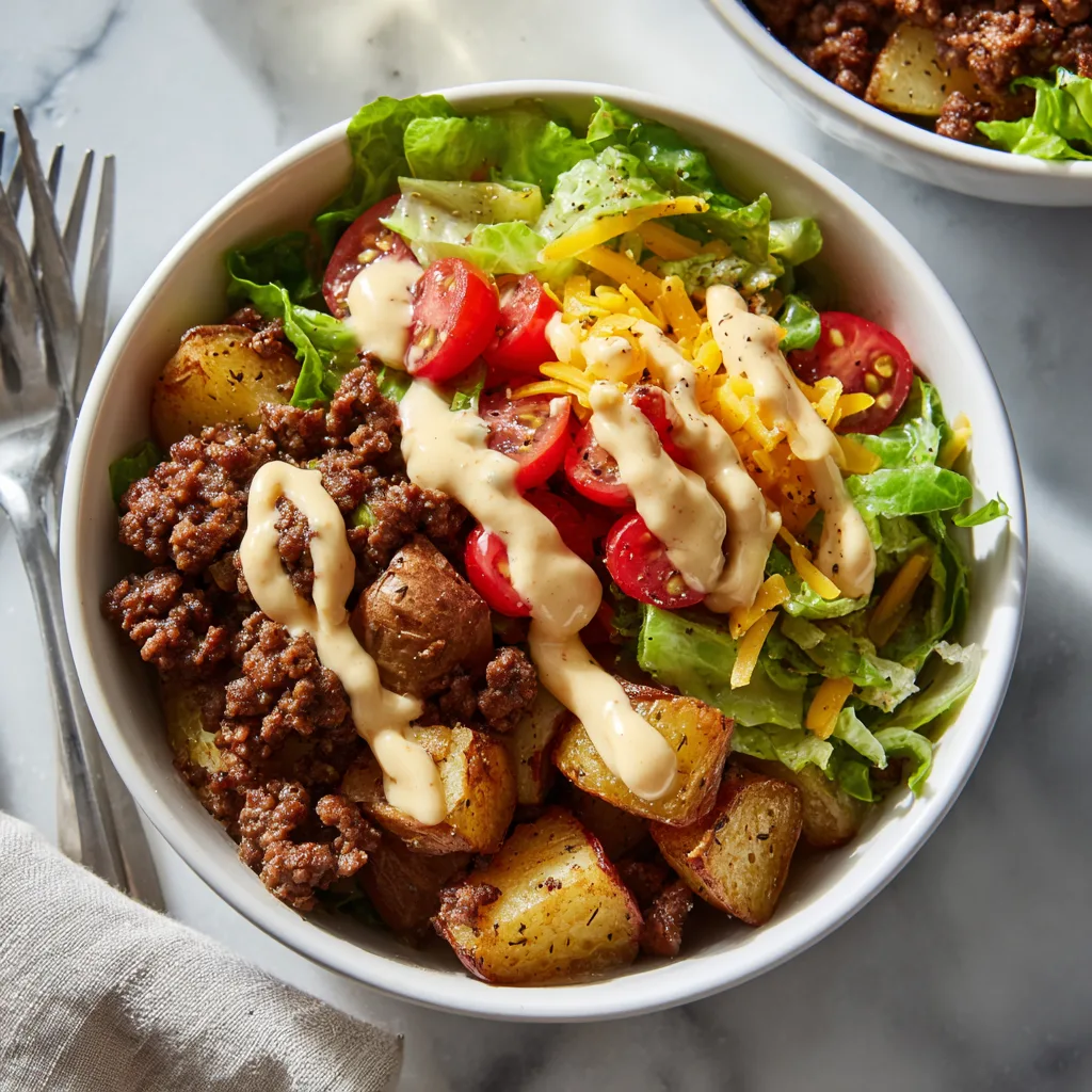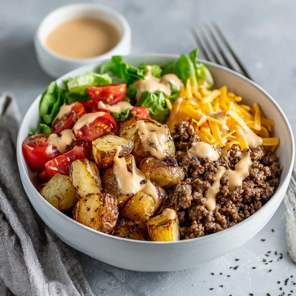 A deconstructed burger bowl packed with seasoned beef, roasted potatoes, fresh toppings, and a creamy homemade special sauce.
