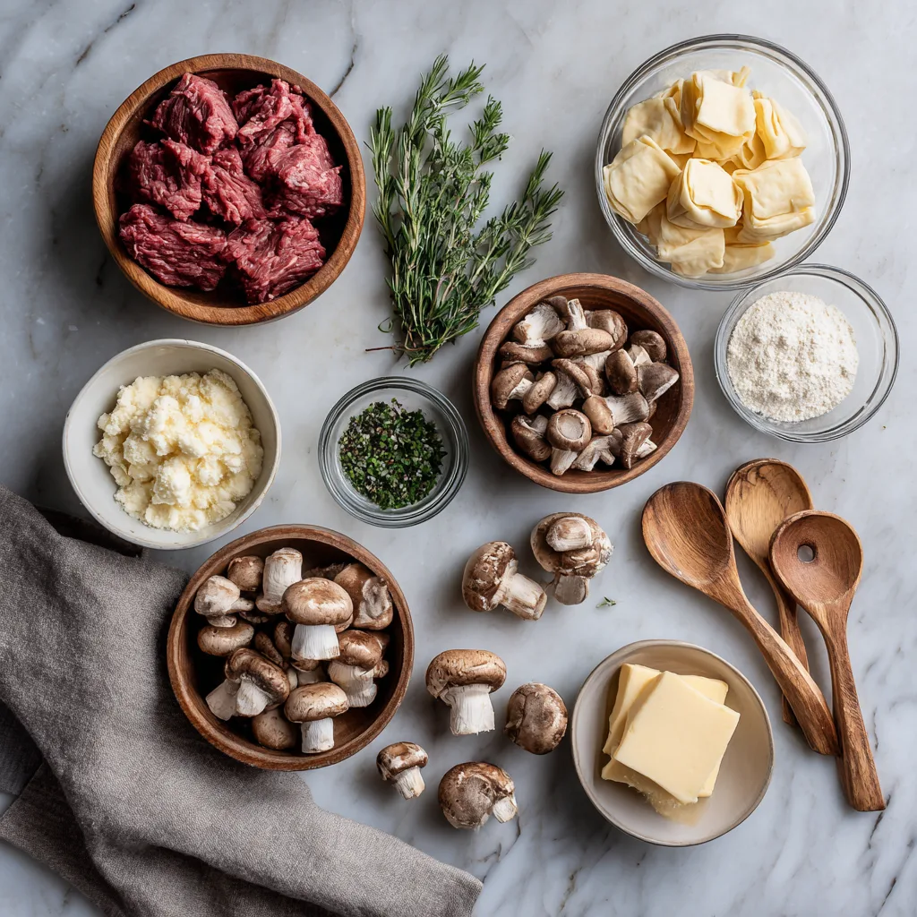 1. Prepare the Beef: Pat the beef cubes dry and season generously with salt and pepper. Heat olive oil in a skillet over medium-high heat. Sear the beef cubes for 1–2 minutes per side until browned but not cooked through. Remove and let cool.