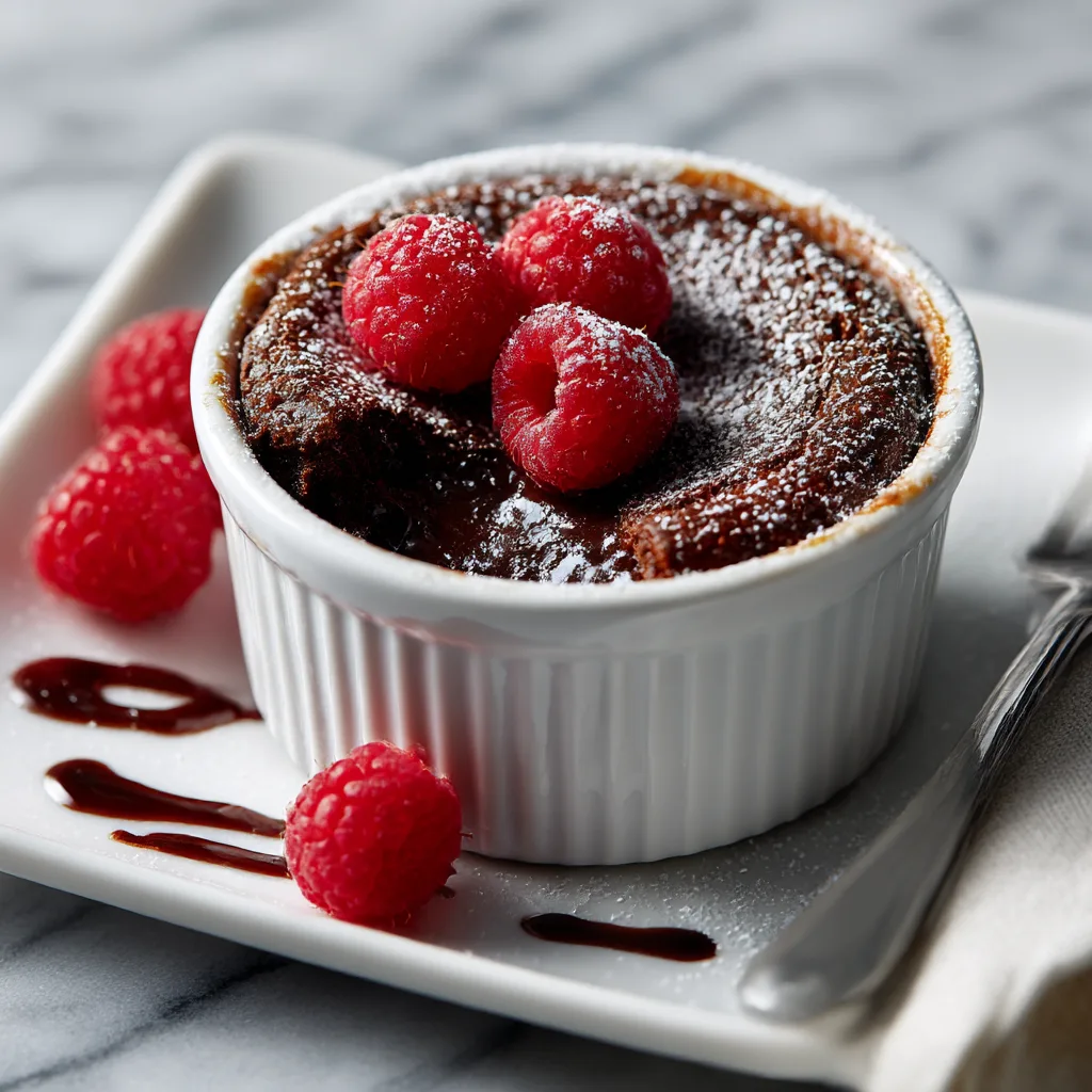 A rich, decadent chocolate lava cake with a warm raspberry center, perfect for romantic dinners and special occasions.
