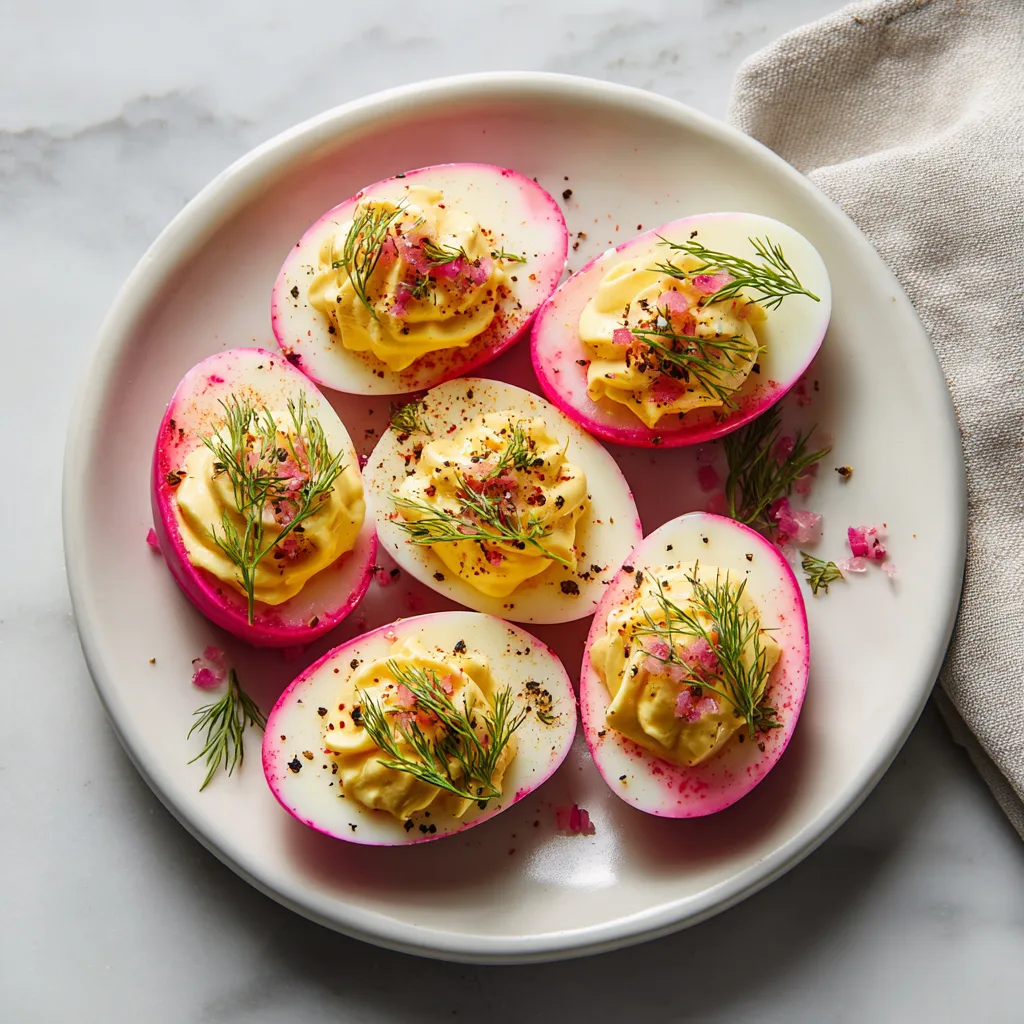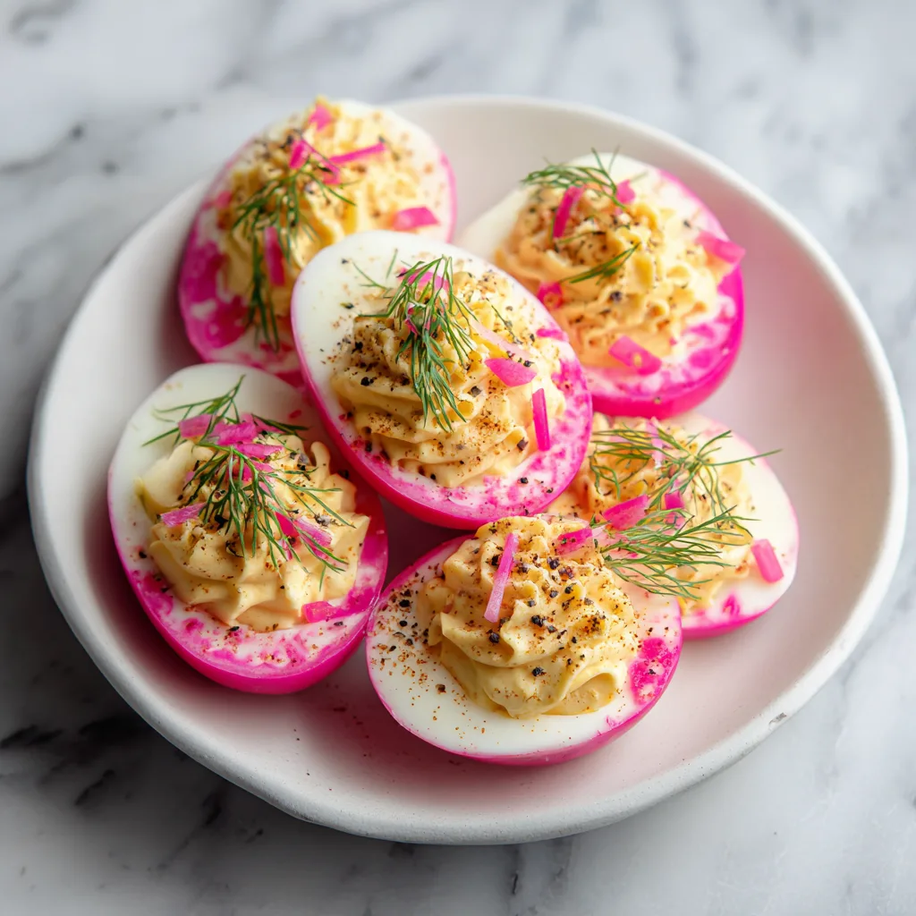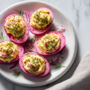 These deviled eggs aren’t just pretty. The naturally dyed pink egg whites come from soaking boiled eggs in tangy pickled red onion brine, infusing them with subtle acidity and a gorgeous rosy hue. Paired with a creamy, savory yolk filling and topped with delicate pickled onions or herbs, this recipe balances richness, brightness, and texture in every bite.
