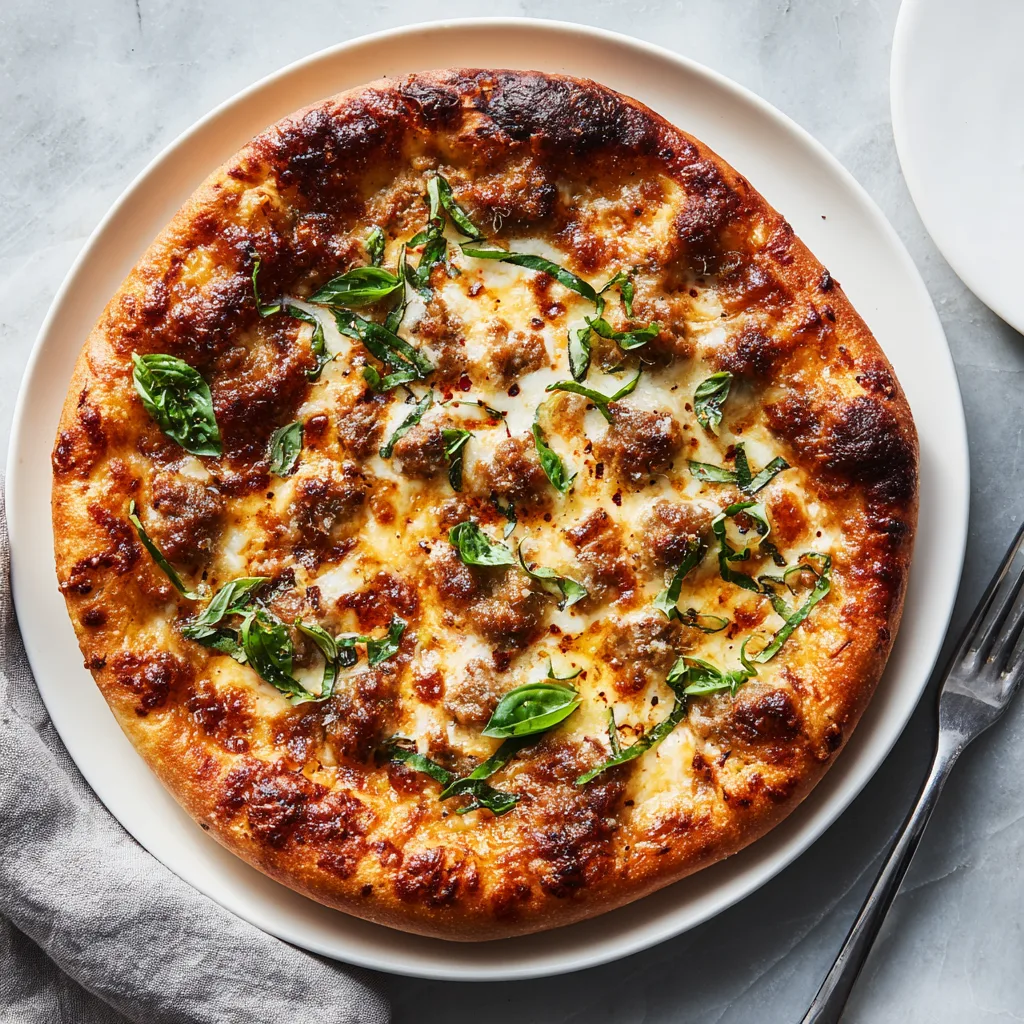A gourmet homemade pizza with spicy sausage, creamy ricotta, melted mozzarella, and a sweet-hot honey drizzle.