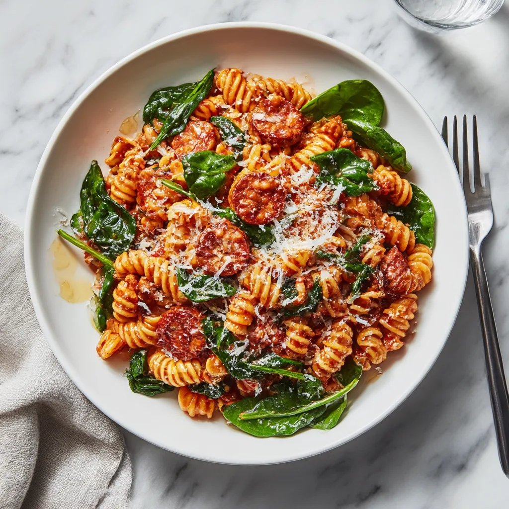 Balanced and satisfying: Protein from sausage, greens from spinach, and carbs from pasta.