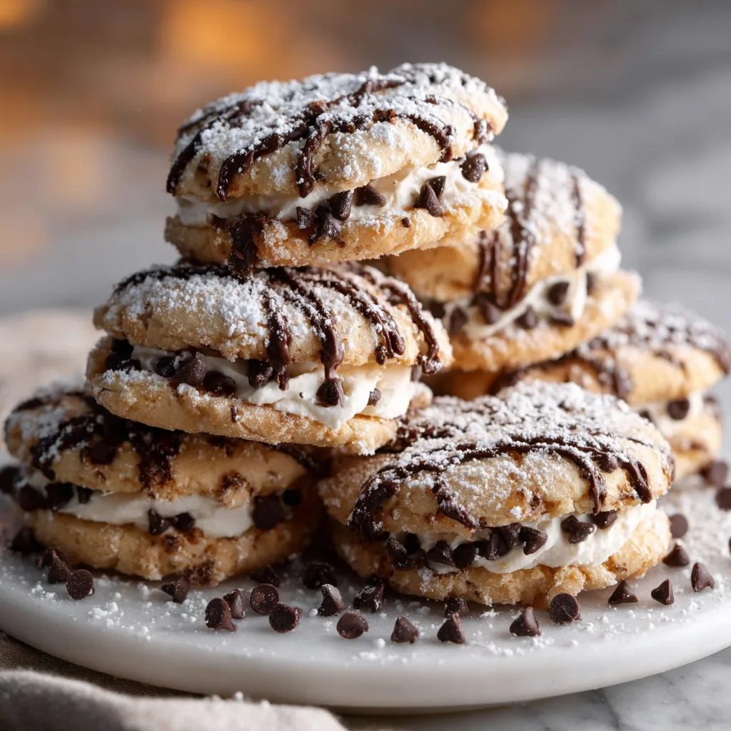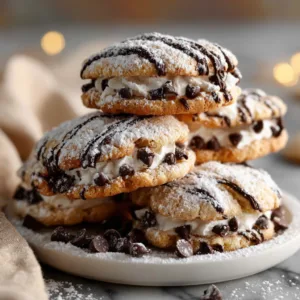 First, they’re incredibly soft. Thanks to the balance of butter, sugar, and gentle baking, these cookies stay tender for days. Second, the ricotta filling is lightly sweetened and whipped until silky smooth, giving you that authentic cannoli flavor without heaviness. Third, they’re visually stunning — dusted with powdered sugar and dotted with chocolate chips, they look like they came from an Italian bakery window.