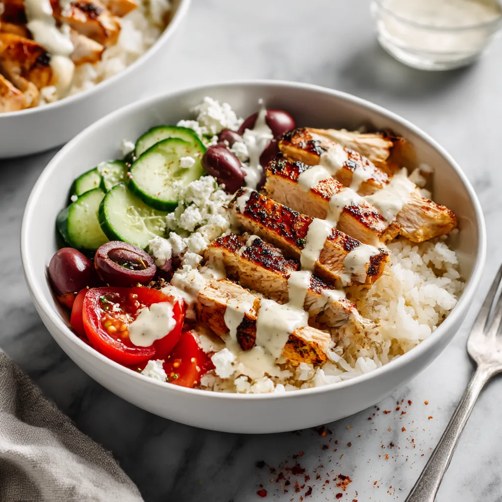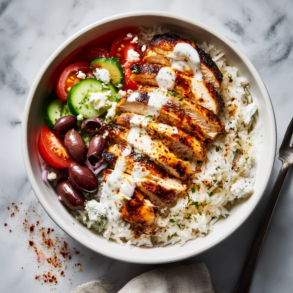 - Assemble bowls with rice, chicken, veggies, olives, feta, and drizzle sauce on top.