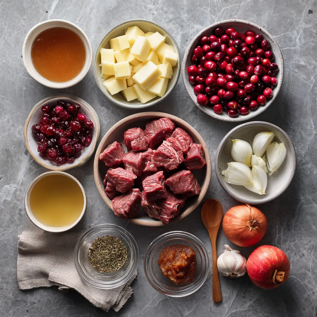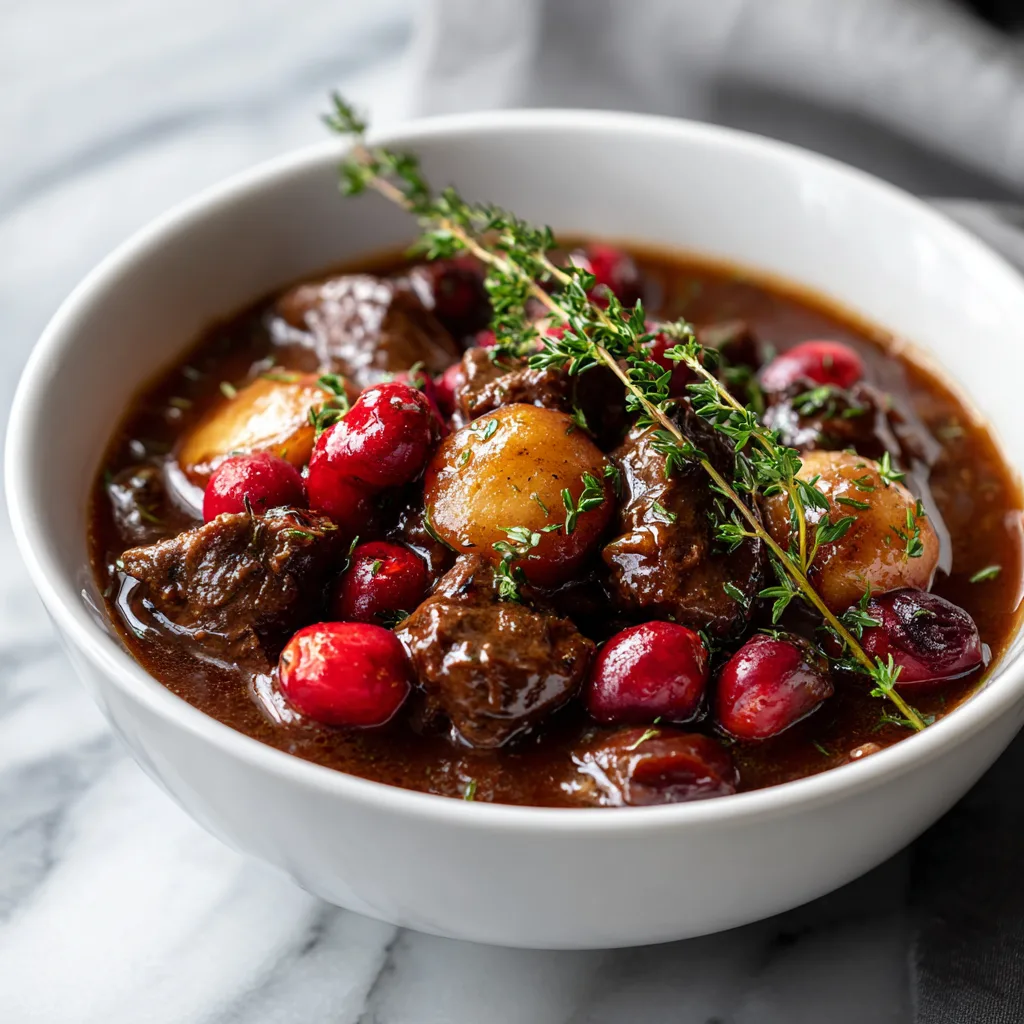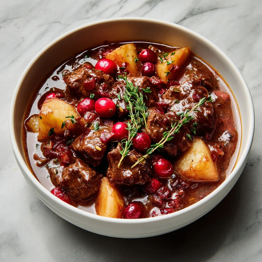 A hearty beef stew combining tender beef, tart cranberries, and sweet apples in a rich, savory broth.