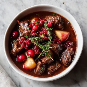 Unlike traditional beef stews that lean heavily on potatoes and carrots, this recipe introduces fruit in a way that enhances rather than overwhelms. The cranberries bring brightness and acidity, while apples soften into the broth, adding subtle sweetness that rounds out the savory notes of beef, herbs, and aromatics. The result is a stew that tastes complex, comforting, and unforgettable.