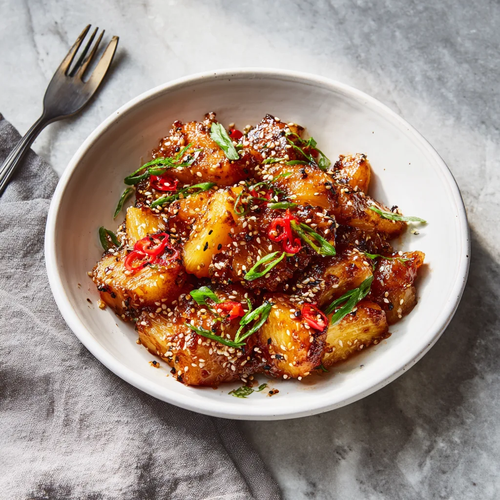 This recipe is inspired by Hawaiian and Asian-fusion flavors. The natural sugars in pineapple caramelize beautifully with teriyaki sauce, while the chicken absorbs all that sticky goodness. Served inside hollowed pineapple halves, it looks impressive with almost no extra effort.