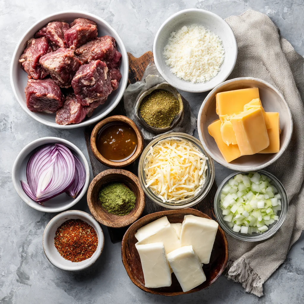 2. Cook the beef in a skillet over medium heat with olive oil. Add onions and cook until softened. Stir in garlic and cook briefly.
