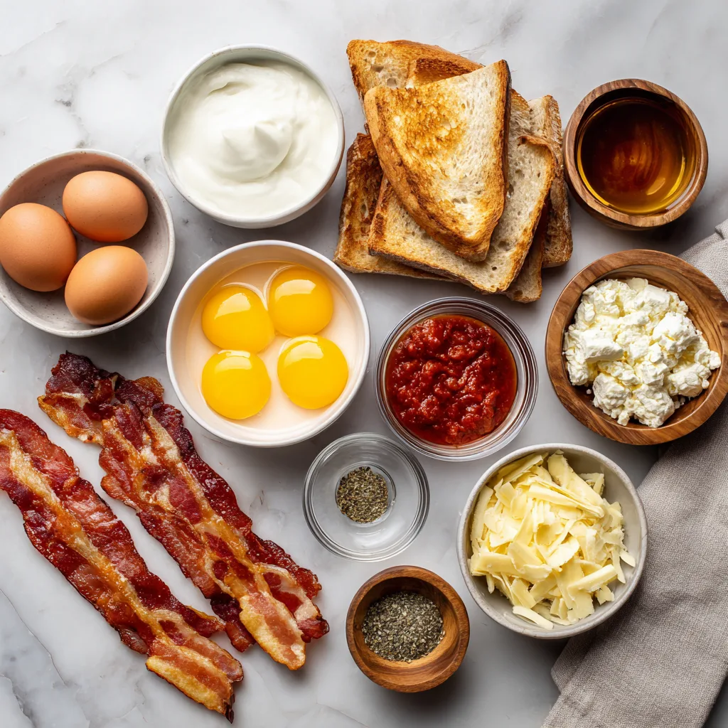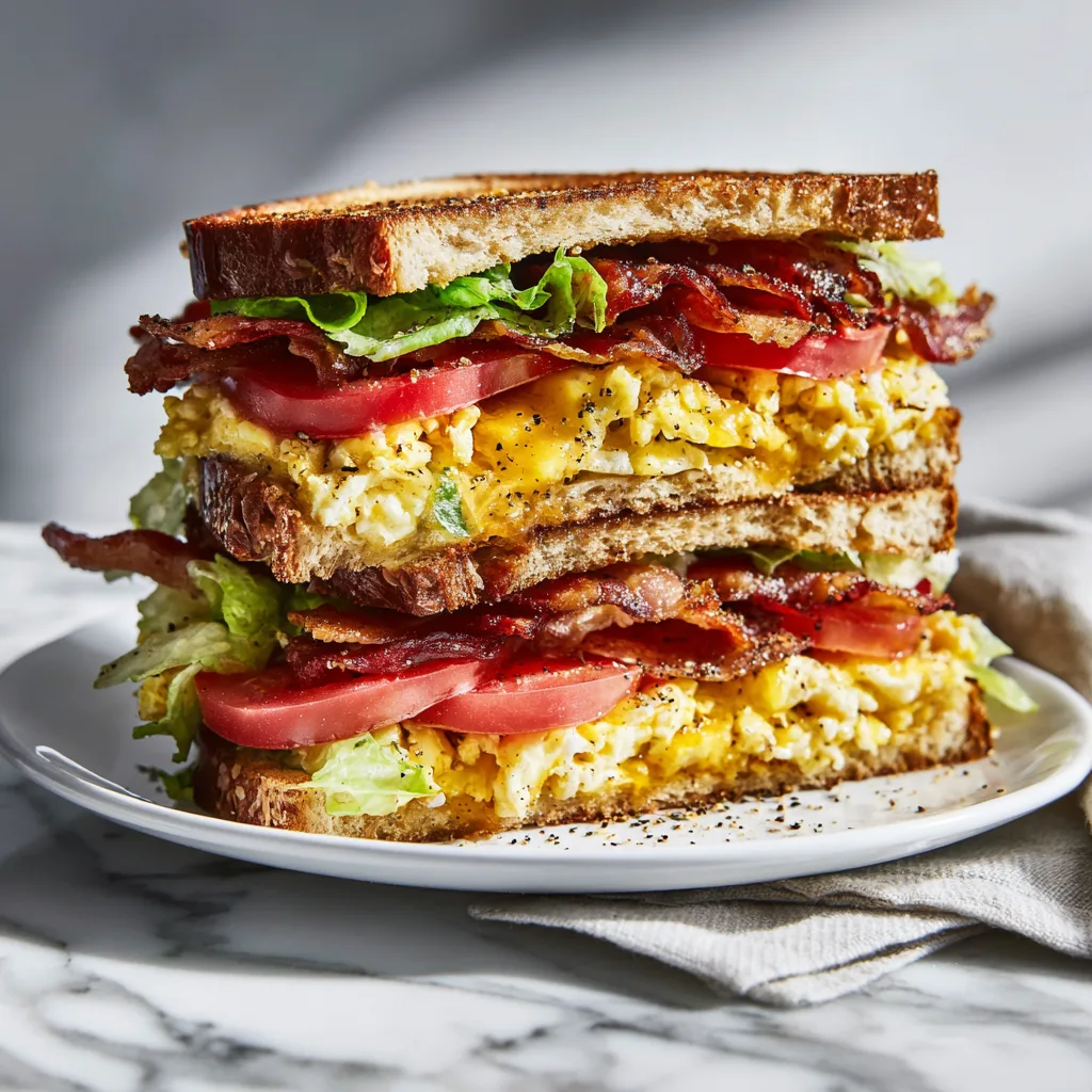 - Layer toast with eggs, cheese, bacon, lettuce, tomato, and sauce.