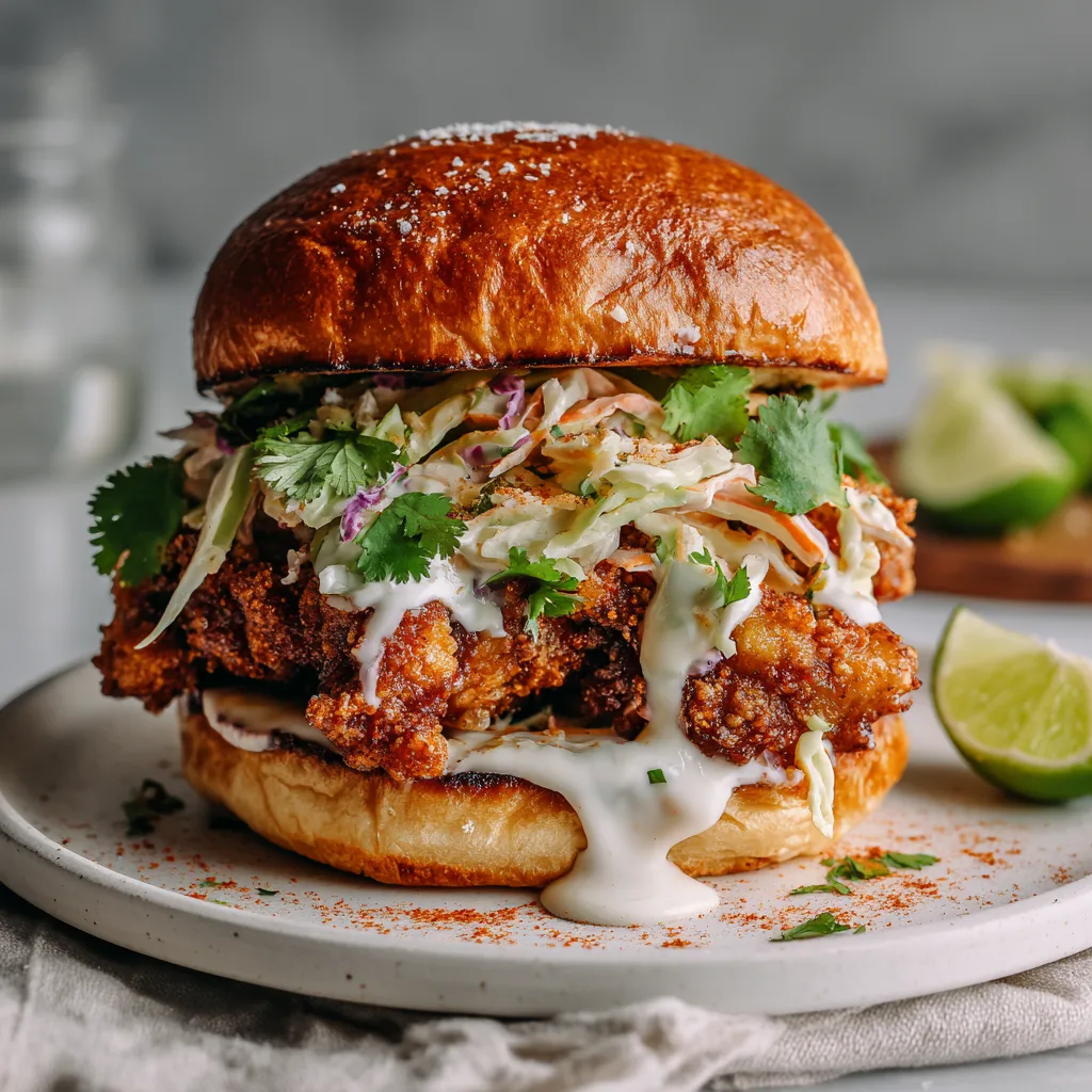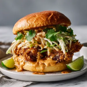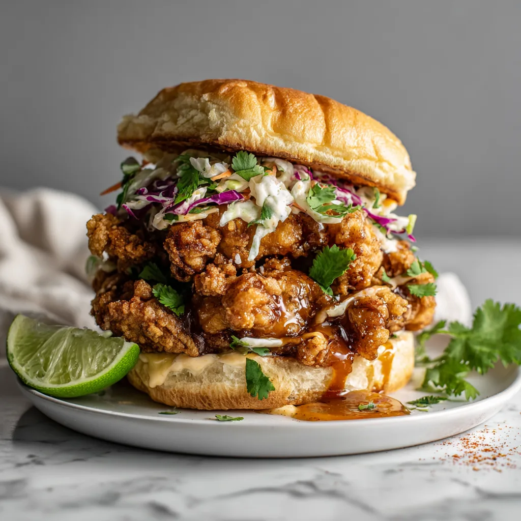 What makes this sandwich special isn’t just the seasoning. It’s the layered technique: a flavorful Thai-inspired marinade, an ultra-crispy coating engineered for maximum crunch, and a creamy chili sauce that ties everything together. Add a soft toasted bun and fresh slaw, and you have a sandwich that feels restaurant-worthy but is completely achievable at home.